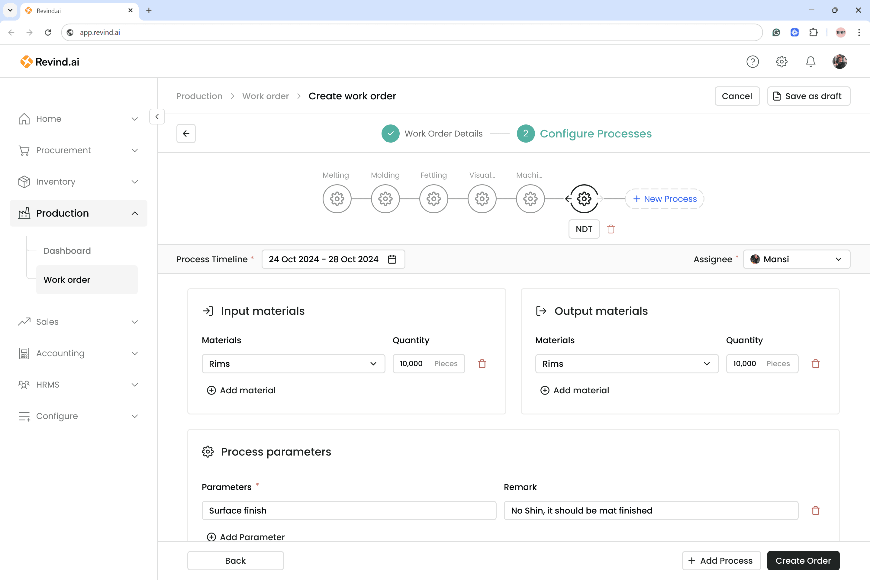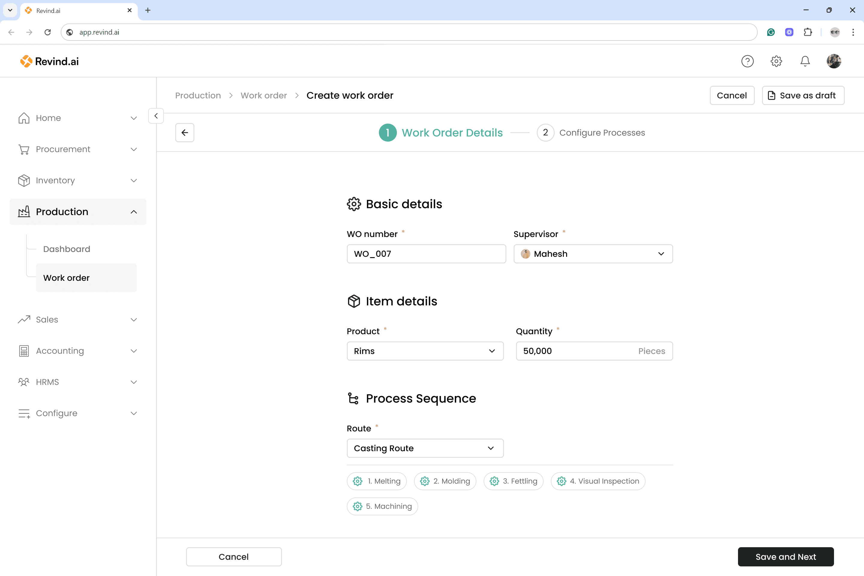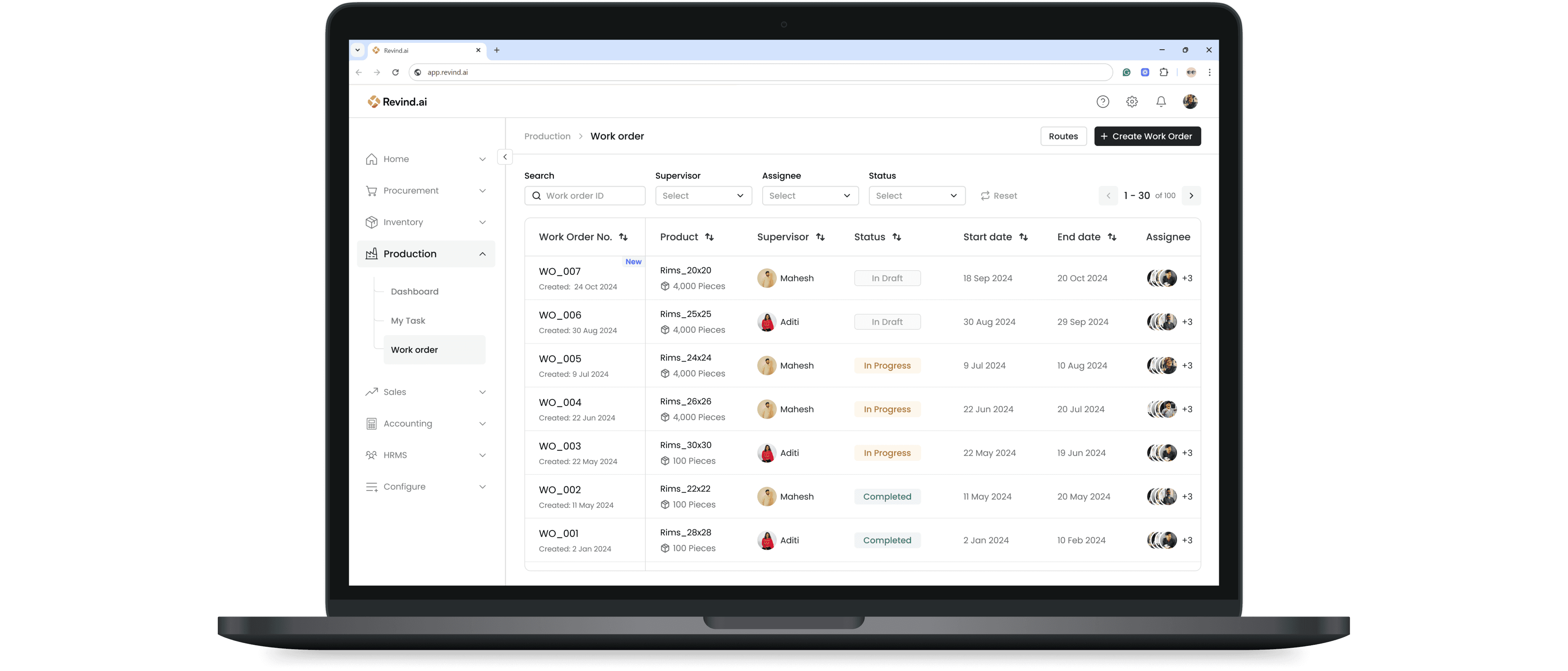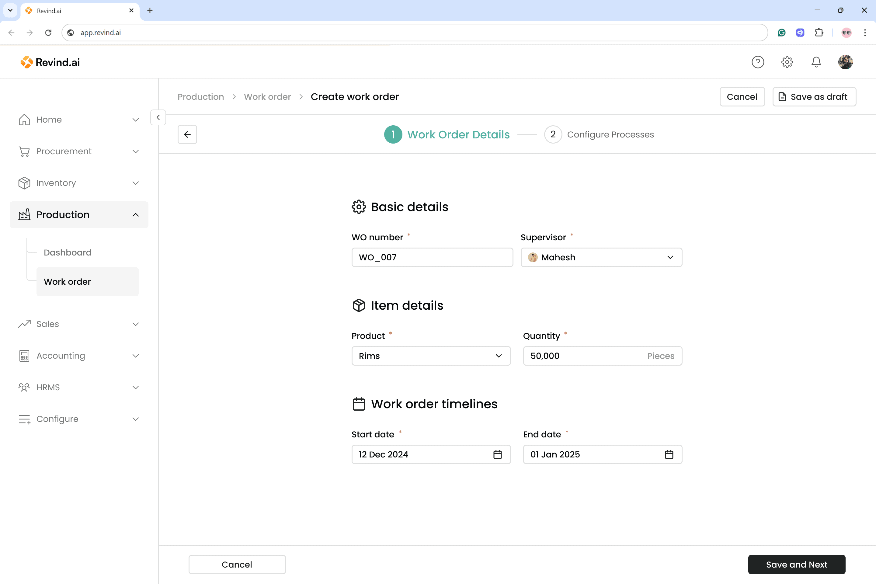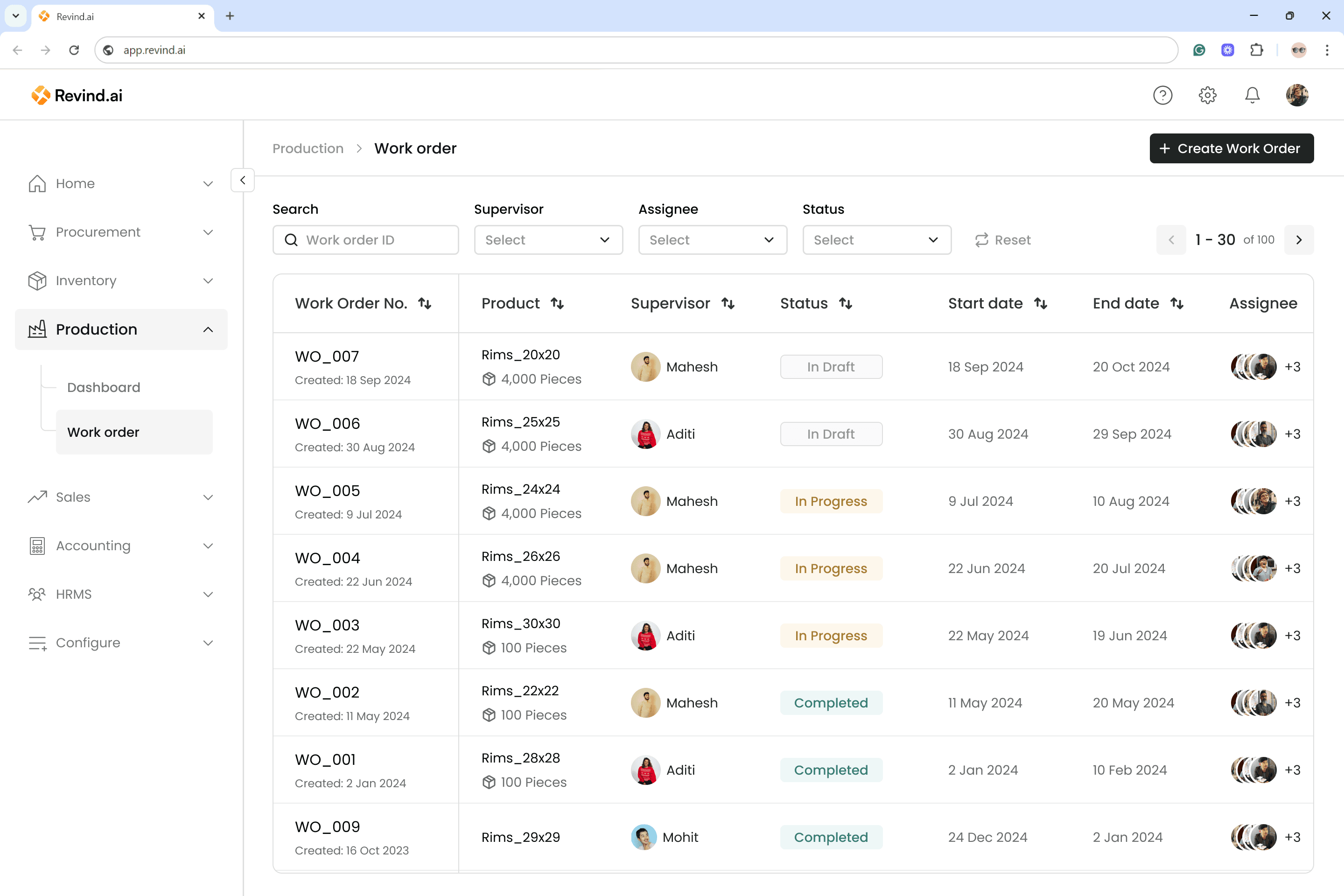 Revind has introduced the “Work Orders” feature to manage all your production needs. You can now create production plans based on upcoming sales orders from the sales team and also track the progress of previous work orders in real time.